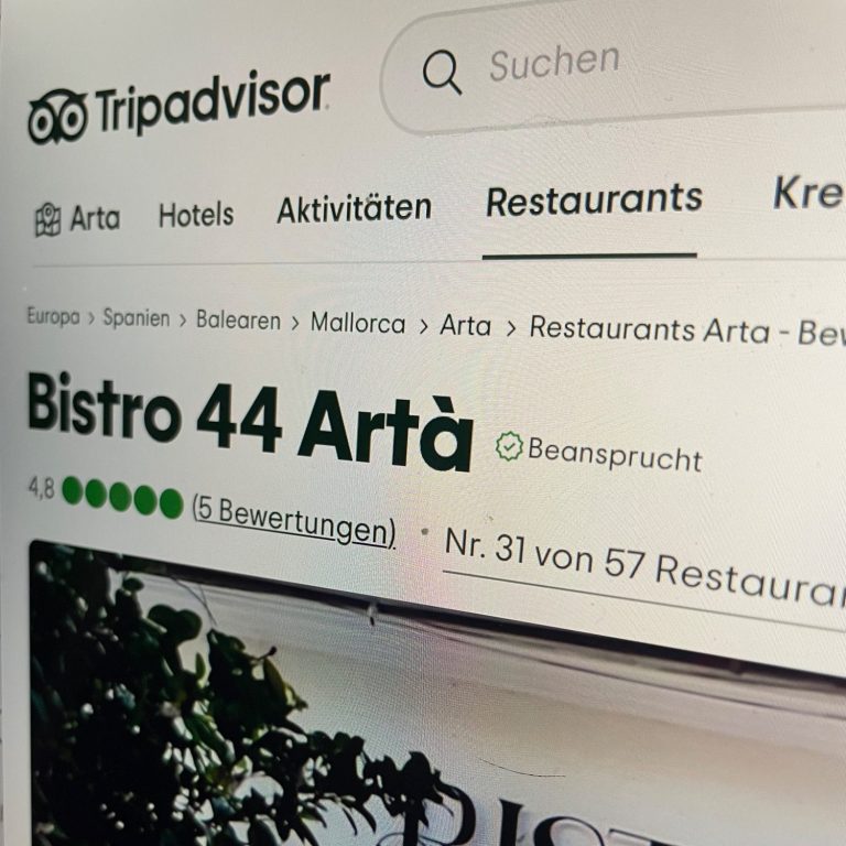 Unser Platz ist begrenzt. Daher bitten wir Sie am besten vorher zu reservieren. Vorallem wenn es eine etwas grösser Gruppe ist oder wir eine Themenwoche anbieten. Eine Reservierung ist über Telefon/Whatsapp (+34 655 42 29 72), E-mail (info@bistro44arta.es) oder über unser Kontaktformular (Link) mögliche. Wir freuens uns auf Ihre Nachricht und heissen Sie herzlich Willkommen!