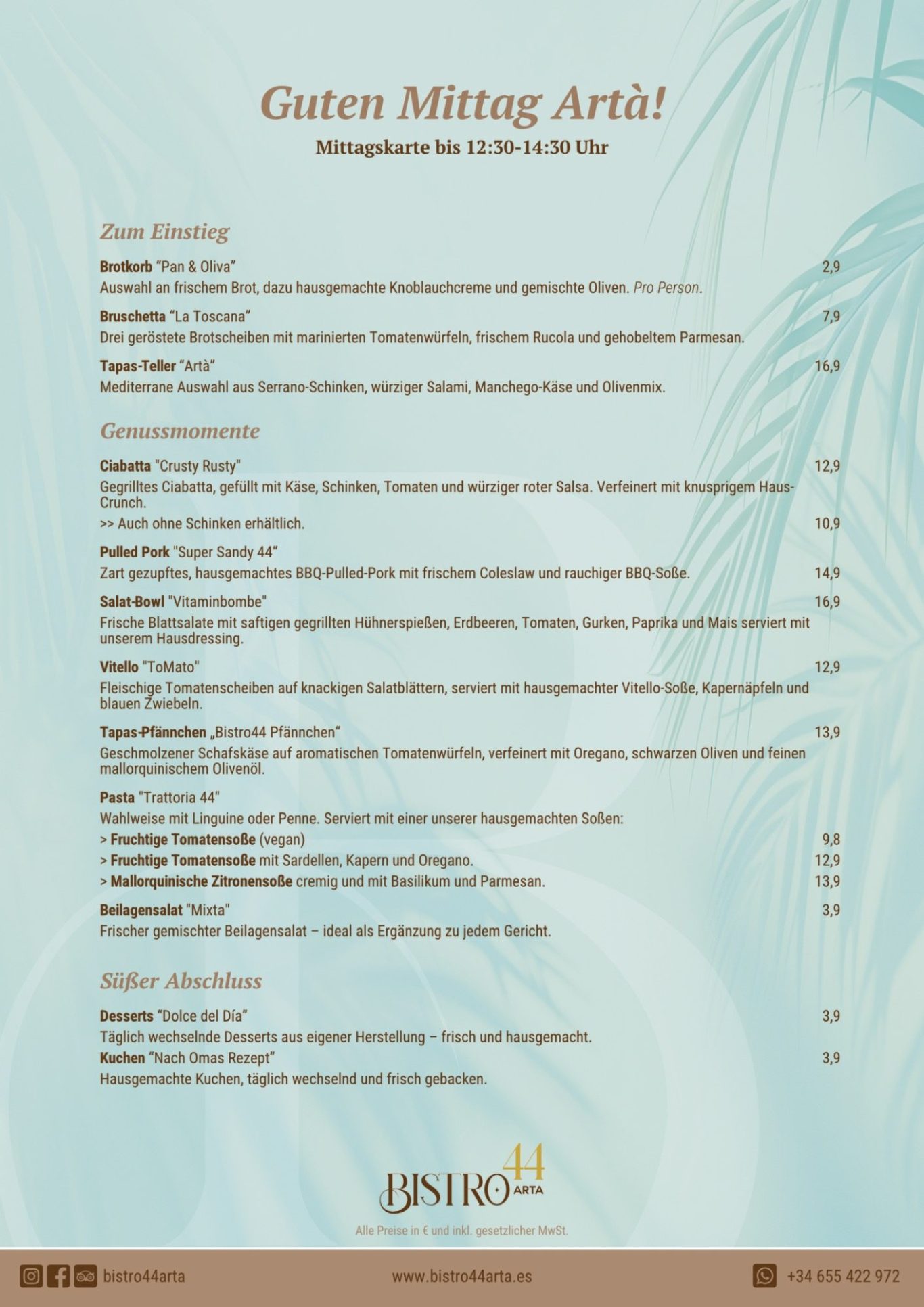 Genießen Sie mediterrane Bistroküche mit frischen Zutaten und viel Liebe zum Detail. Von knuspriger Bruschetta und Tapas über kreative Salate und hausgemachte Pasta bis hin zu herzhaften Fladenbrot und BBQ-Pulled Pork – bei uns wird jedes Gericht frisch zubereitet. Entspannen Sie bei einem genussvollen Mittagessen im Bistro44 im Herzen von Artà.