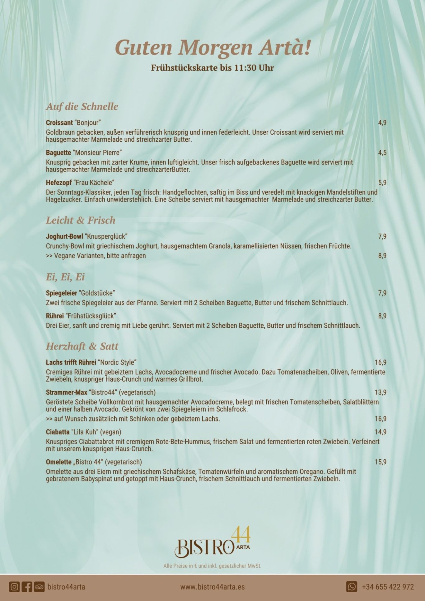 Starten Sie entspannt in den Tag mit einem liebevoll zubereiteten Frühstück im Bistro44. Ob knuspriges Croissant mit hausgemachter Marmelade, cremige Joghurt-Bowls oder herzhafte Klassiker wie Rührei, Strammer Max und Omlette – bei uns beginnt der Morgen frisch, genussvoll und ganz ohne Eile. Genießen Sie Ihr Frühstück im Herzen von Artà.